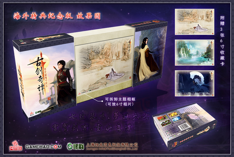 《古剑奇谭》海外特典纪念版在外形上,延续了《古剑奇谭》台湾繁体版华丽唯美的封面设计,并将包装结构巧妙的划分为内盒与外盒两部分,拆分后可组成相框,为精美的外包装盒赋予了更多价值。除此之外,《古剑奇谭》海外特典纪念版还附赠了精美的《古剑奇谭》磨砂版画等超值礼品,喜爱收藏的玩家千万不要错过哦!