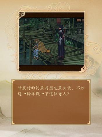 进入甘泉村后,与馋叟对话。鱼头煲(食谱在江都)可通过烹饪系统制作,若有物品中有鱼头煲,再次与之对话即可完成该任务