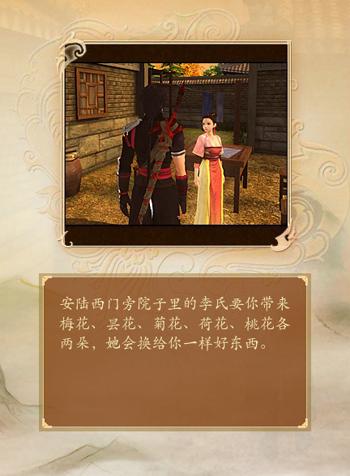 任务奖励:玄锦玉衣(晴雪外装,防+25,五灵属性+6) 进入安陆县能自由活动后,与李氏对话,她会要求带来梅花、昙花、菊花、荷花、桃花五种花各两朵,集齐五种花后,再次与之对话即可完成该任务